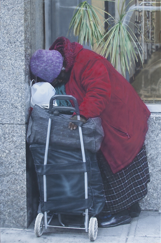 The story behind the image:The granite wall demonstrates a last respite of hope among disenfranchised in New York City who have no reasonable place to lay their heads for rest. Homeless, she carries her belongings with her wherever she goes.